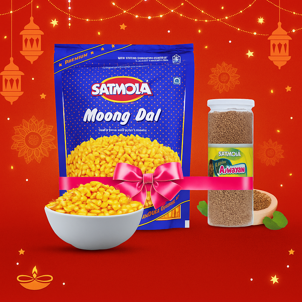 This Satmola Gift Pack includes Moong Dal Namkeen (350g) and Ajwain Tasty & Digestive Bottle (220g) — perfect for festive snacking, gifting, or enjoying healthy treats anytime.