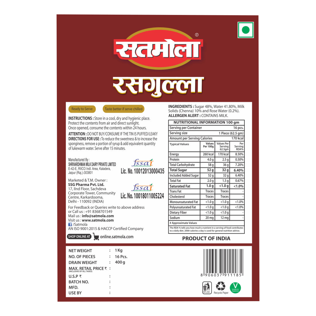 Enjoy the melt-in-mouth taste of Satmola Rasgulla, a classic Indian sweet made with pure ingredients. Soft, spongy, and juicy – perfect for festivals, gifting, and family celebrations.